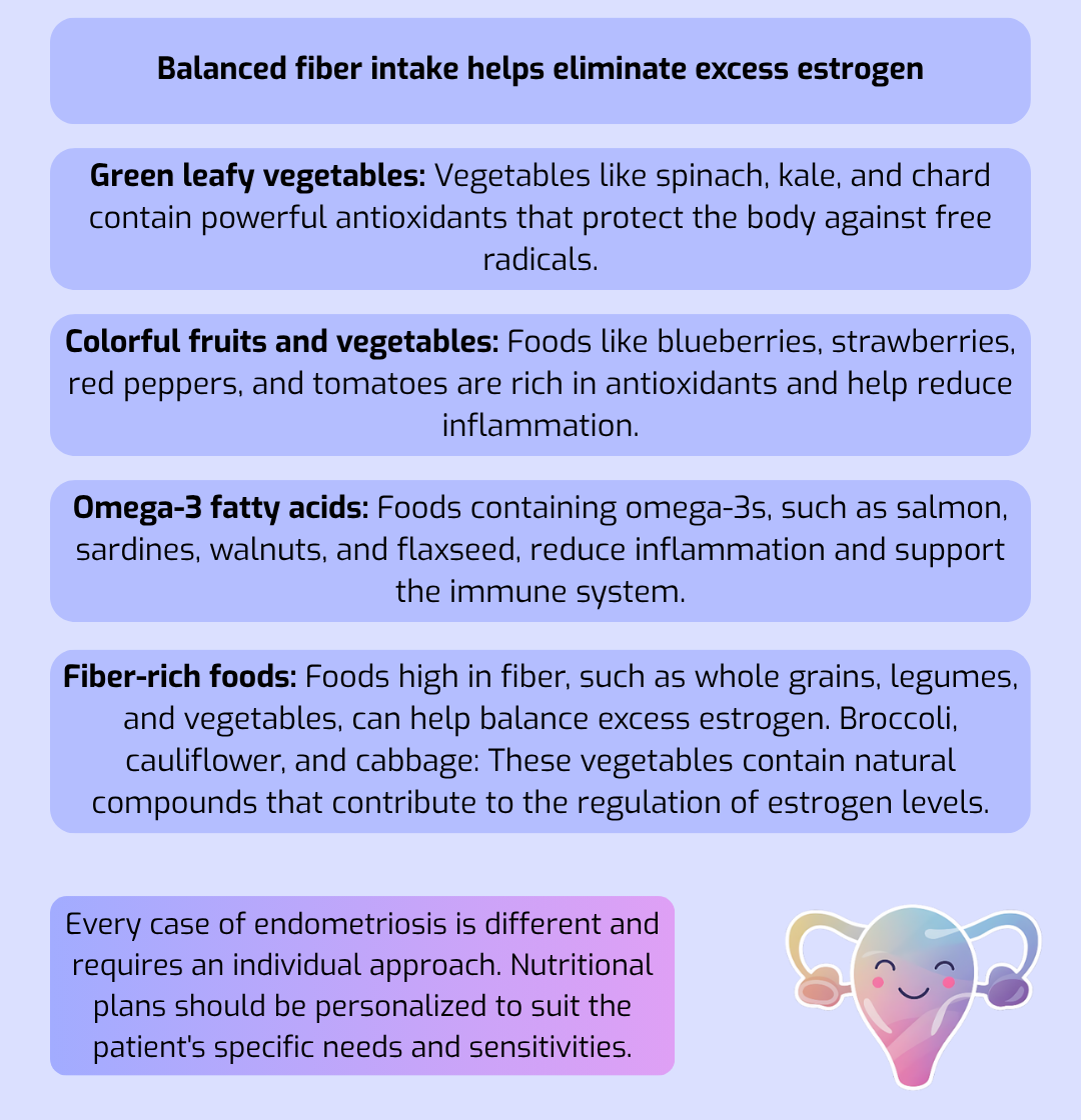 In this context, understanding which nutrients are most effectively metabolized by the body can contribute to a more efficient alleviation of inflammation-related symptoms. For instance, although fiber plays a crucial role in supporting the proper functioning of the digestive system, excessive intake may lead to constipation and bloating, which can exacerbate symptoms depending on the location of endometriosis.