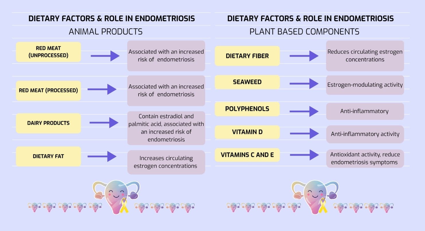 - Barnard ND, Holtz DN, Schmidt N, Kolipaka S, Hata E, Sutton M, Znayenko-Miller T, Hazen ND, Cobb C, Kahleova H. Nutrition in the prevention and treatment of endometriosis: A review. Front Nutr. 2023 Feb 17;10:1089891. doi: 10.3389/fnut.2023.1089891. PMID: 36875844; PMCID: PMC9983692.